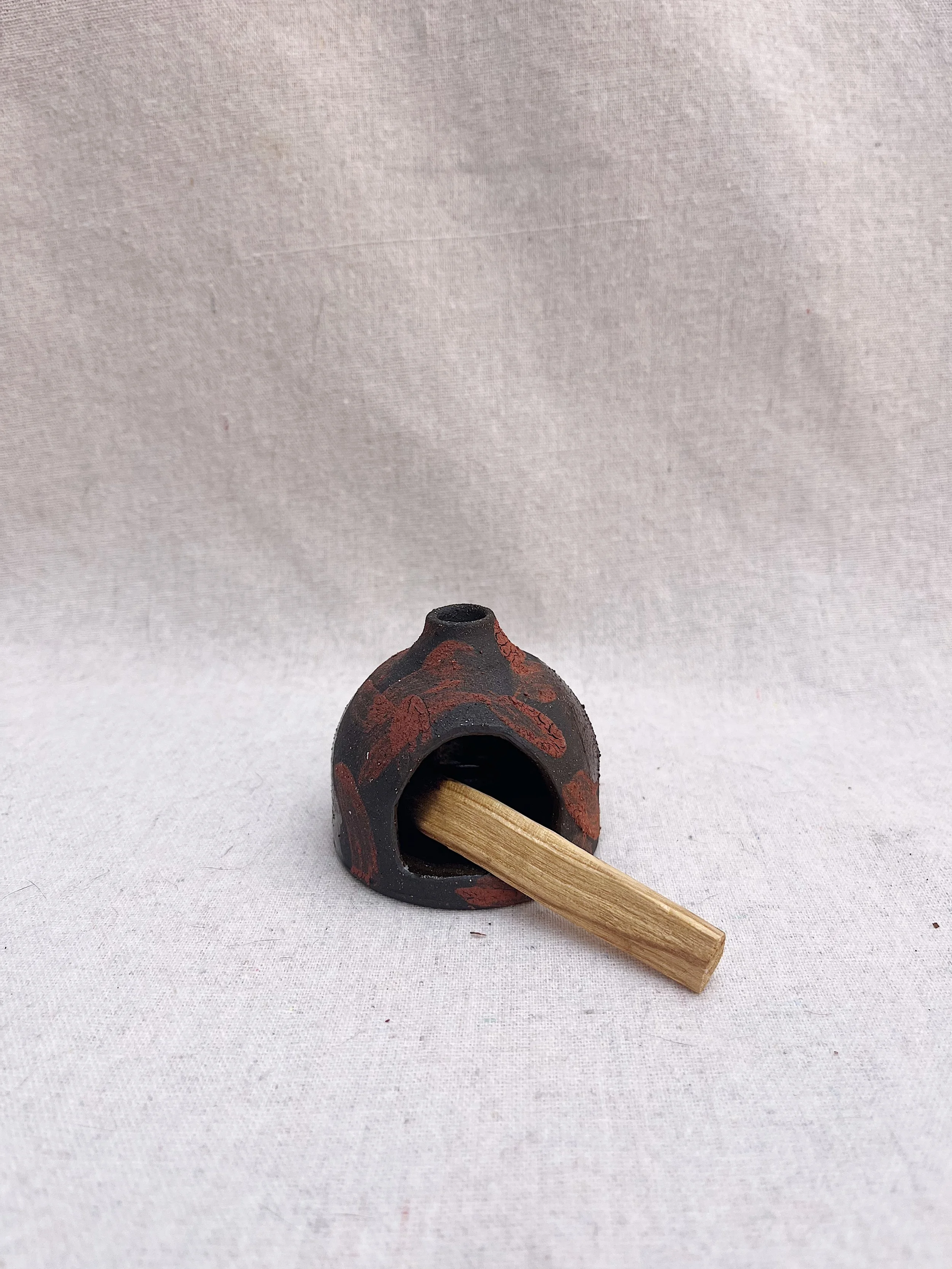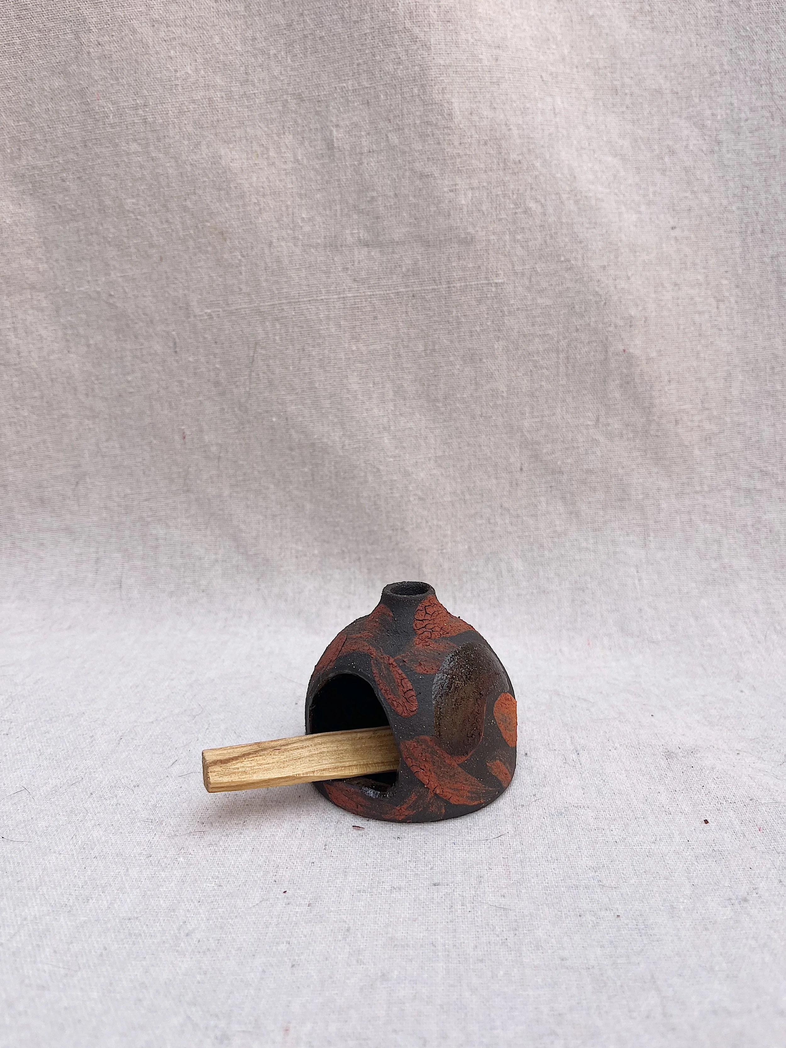 These smoke homes are the perfect landing space for your cone incense or palo santo. The foraged smoke home is painted on with foraged california clay. Simply light the scent of your choice, set it in the smoke home, and watch the smoke billow out of the top.
